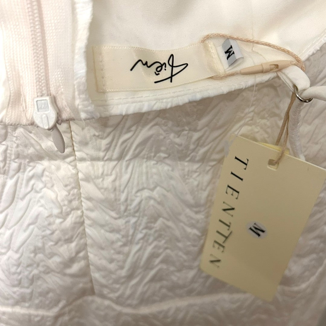 A cream-colored midi dress with a textured jacquard fabrication. This elegant sheath dress features a flattering sweetheart neckline adorned with a delicate bow detail and spaghetti straps. A subtle front slit adds a touch of sophistication and ease of movement. The dress closes with a discreet zipper at the back. Perfect for a cocktail party, a wedding guest outfit, or an evening out.